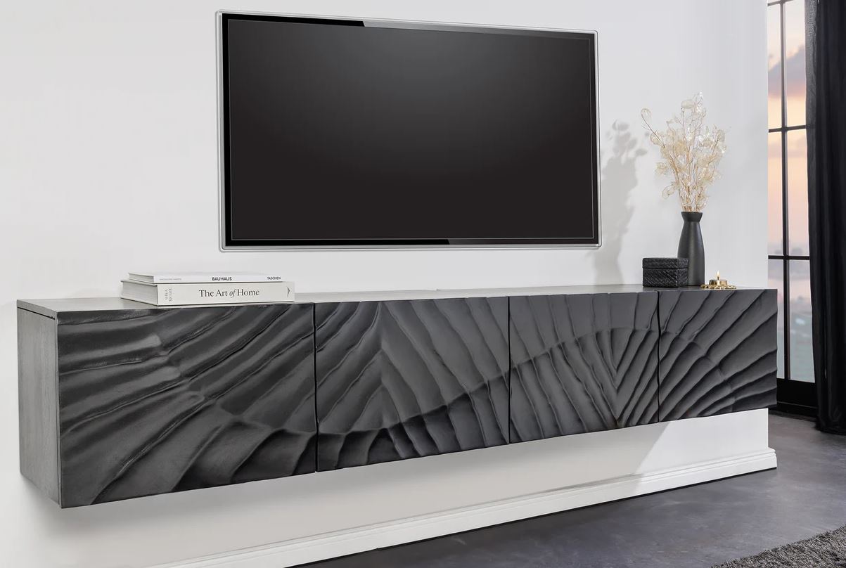 Gemonteerd hangend TV dressoir voorzien van drie deuren. De deurfronten zijn fraai voorzien van schorpioenmotief. Het bovenpaneel is voorzien van kabeldoorvoer opening. Het meubel wordt d.m.v. ophangbeugels aan de muur bevestigd. Eyecatcher in iedere woonomgeving! Dit hangende tv-meubel is verkrijgbaar in de afmeting lxdxh: 160 x 33 x 29 cm Overige informatie: deuren met schorpioenmotief deuren met magneetsluiting Kleur: zwart Materiaal: massief mangohout