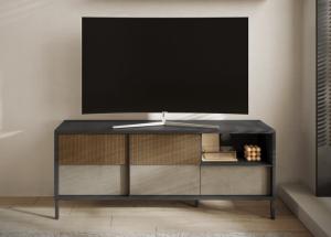 TV-meubel met moderne sfeervolle organische vormgeving en bovenblad van 5 cm dik. Afmeting bxdxh 159,5 x 44,5 x 40 cm Kleur: cement Materiaal: MDF
