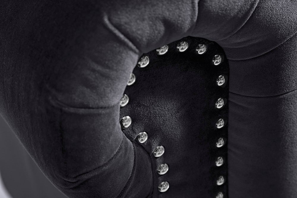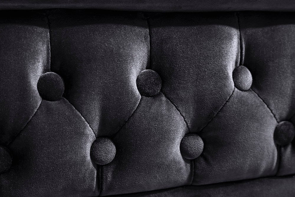 Voeg een vleugje Britse elegantie toe aan uw woonkamer met deze 3-zitsbank in elegant zwart. De zachte fluwelen bekleding zorgt niet alleen voor een luxe uitstraling, maar voelt ook bijzonder aangenaam aan. De karakteristieke gebogen armleuningen, het klassieke ruitpatroon met knoopstiksels en de sierklinknagels geven de bank zijn onmiskenbare uitstraling.
