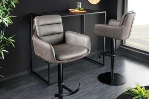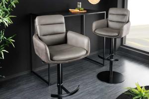 Vintage barkruk met robuuste kuipzitting met armleuningen. Afmetingen b x d x h: 57 x 53 x 100 cm Overige ca afmetingen: Zithoogte: 74 cm Zitdiepte: 36 cm Zitbreedte: 39 cm Kleurcombinatie: Zitting: antiek grijs Onderstel: zwart Materiaal: Zitting: microvezel (100% Polyester) Onderstel: metaal poedercoating