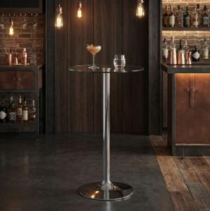 Moderne in hoogte verstelbare bartafel voorzien van glanzend chroom onderstel en 8 mm glazen tafelblad. Het tafelblad wordt door middel van metalen bevestiging aan het onderstel bevestigd. Zie hiervoor afbeelding twee. Deze bartafel is verkrijgbaar in de afmeting (lengte x breedte x hoogte): 60 x 60 x 83-104 cm Materiaal: verchroomd metaal / veiligheidsglas