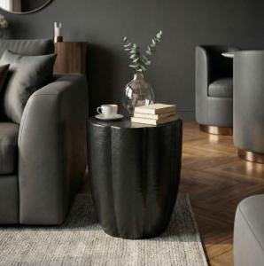 De Bijzettafel zwart metaal is een stijlvolle en elegante bijzettafel van metaal met geribbeld onderstel en tafelblad met hamerslag structuur. Afmeting Ø x H: 40 x 50 cm Kleur: zwart Materiaal: aluminium met poedercoating