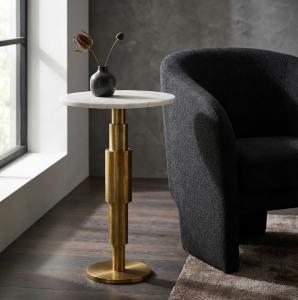 Moderne design bijzettafel voorzien van tafelblad in de kleur antiek messing gecombineerd met massieve voet van wit marmer. De voet van écht massief marmer is bij iedere bijzettafel uniek. Deze bijzettafel is verkrijgbaar in de afmeting: Ø 34 cm Hoogte 58 cm Kleurcombinatie: Tafelblad en stang in antiek messing Voet in de kleur wit Materialen: Tafelblad en stang van gelakt aluminium Voet van massief marmer