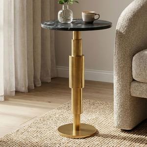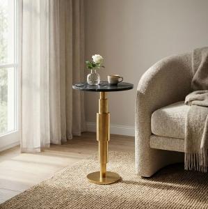 Moderne bijzettafel met tafelblad in de kleur antiek messing fraai gecombineerd met stevige voet van massief marmer. Afmetingen: Ø 30 cm Hoogte 59 cm Kleur: Tafelblad en stang antiek messing Voet in de kleur groen Materiaal: Tafelblad en stang antiek messing Voet van massief marmer