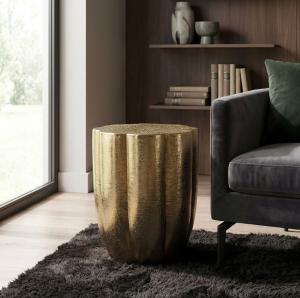 Moderne ronde design bijzettafel goudkleurig voorzien van mooie metaalstructuur. Combineer deze bijzettafel met de bijpassende salontafel uit deze serie! De bijzettafeltafel is verkrijgbaar in de afmeting (BxDxH): 40 x 40 x 46 cm Ø tafelblad 31 cm Kleur: Goud Materialen: Frame van metaal aluminium poedercoating