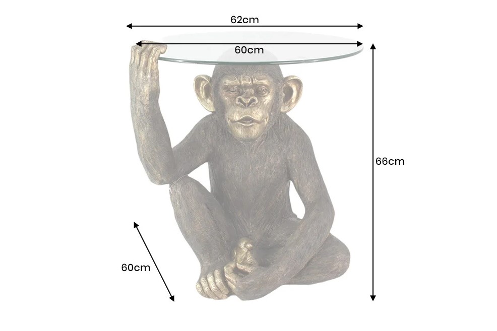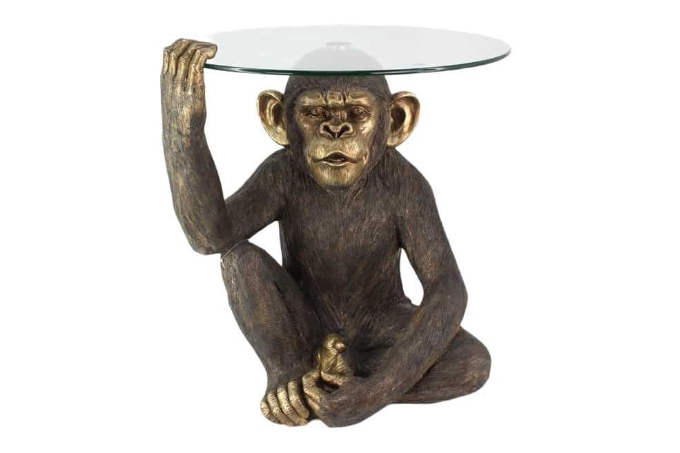 Bijzettafel in de vorm van een aap gecombineerd met tafelblad van transparant veiligheidsglas.