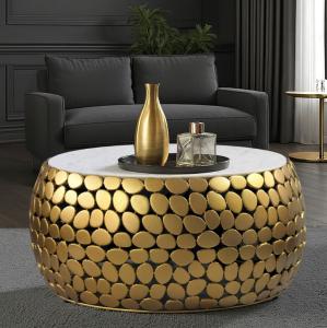 Moderne ronde  design bijzettafel goudkleurig voorzien van tafelblad van wit écht massief marmer.
