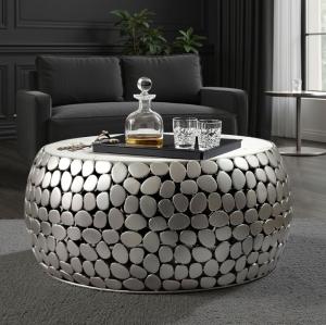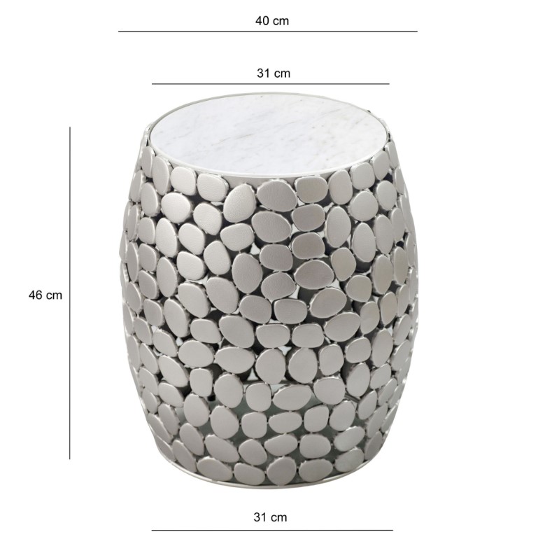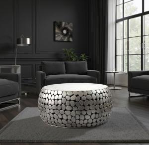 Ronde design eyecatcher salontafel van zilver aluminium gecombineerd met wit tafelblad van écht marmer.