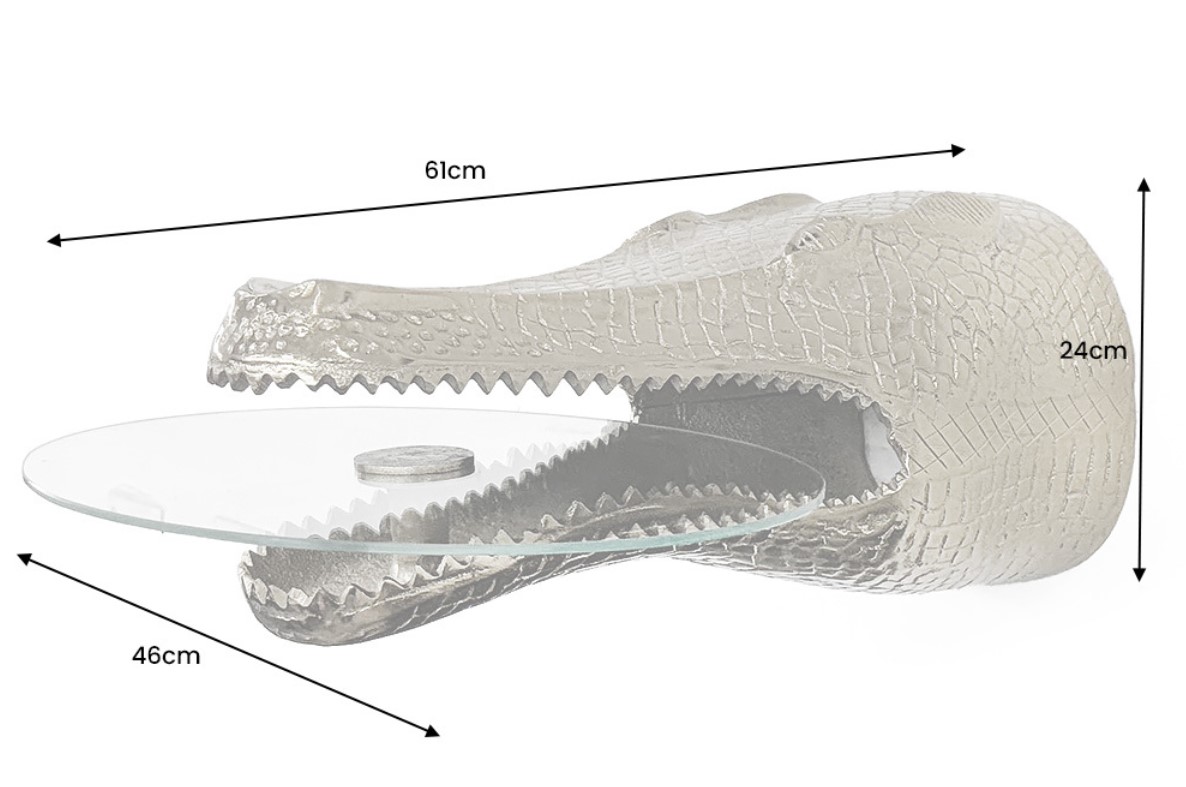 Zwevende bijzettafel met krokodilkop gecombineerd met een tafelblad van transparant veiligheidsglas. Deze hangtafel brengt niet alleen functionaliteit in je huis, maar vertelt ook een verhaal vol avontuur en elegantie. Het gedetailleerde krokodillenbeeld in zilver lijkt bijna levendig en trekt ieders aandacht. Het glazen tafelblad ligt ogenschijnlijk gewichtloos in de mond van de krachtige krokodil en biedt je een stijlvolle ruimte voor je favoriete decoratieve elementen, boeken of een kop koffie.