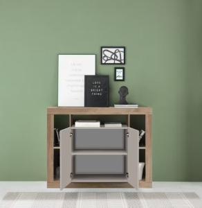 Modern dressoir met twee deuren en decoratieve opbergschappen. Geschikt voor zowel privé als zakelijk gebruik. Deze kast heeft een totale afmeting van BxDxH: 134 x 42 x 102 cm Bijzonderheden: Deuren voorzien van soft-close sluitsysteem Kleurcombinatie: eiken (mercure) / cashmere beige Materialen: geperst hout voorzien van lak/melamine