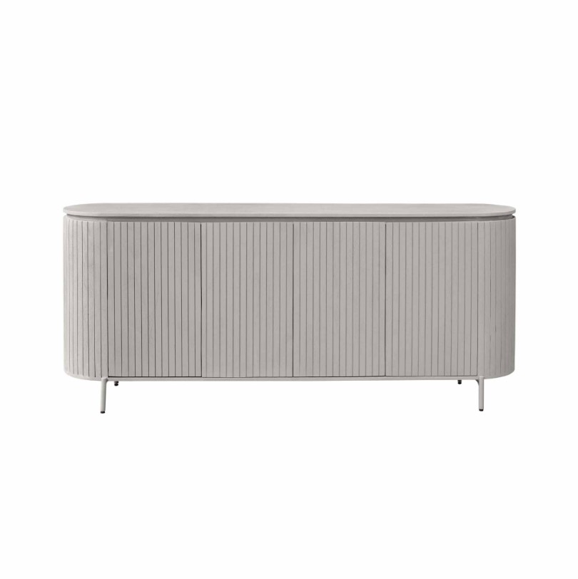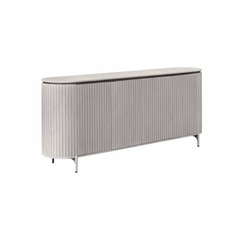 Modern hoog design dressoir compleet van massief mangohout gecombineerd met metalen pootjes. Het meubel is voorzien van een verticaal lattenpatroon op de deuren en de zijkanten. Het meubel biedt veel opbergruimte voor bijvoorbeeld servies en andere persoonlijke items.