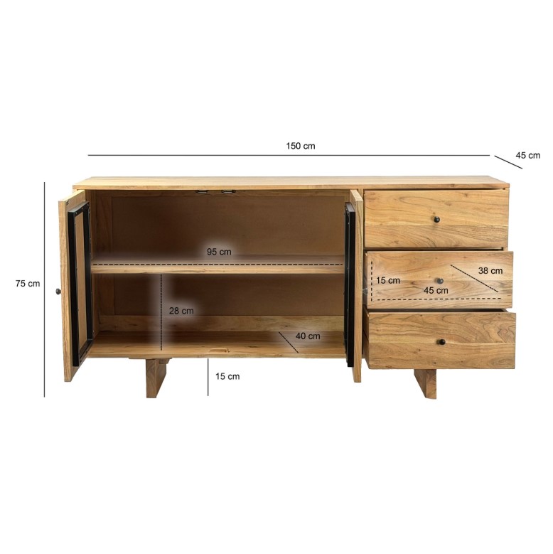 Modern dressoir van massief acaciahout. De deurfronten zijn voorzien van strak lijnenspel. De kast heeft veel opbergruimte achter de twee deuren en drie laden.