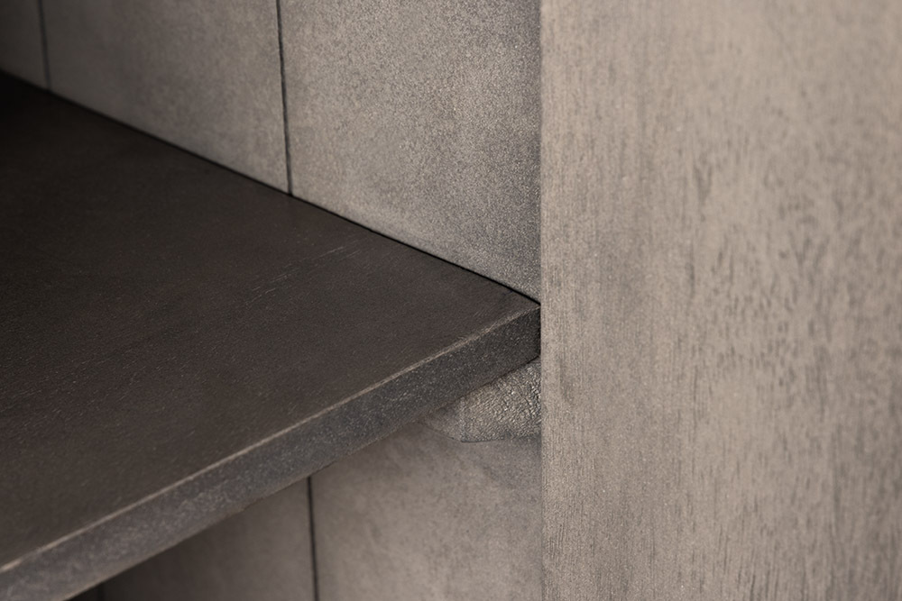 Met dit dressoir maak je een écht stijlstatement! Het dressoir is gemaakt van massief mangohout met op de deuren opvallende 3D-panelen met een geometrisch patroon, dat moderne architectuur en artistiek design combineert. Het grijs gelakte mangohout geeft het meubel een elegante diepte en zorgt voor een fraaie, veelzijdige uitstraling - perfect voor eigentijdse woonruimtes met karakter.