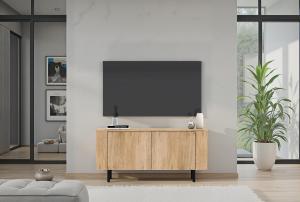 Modern compact dressoir in de kleur eiken cadiz gecombineerd met zwarte metalen poten. De harmonieus gebogen elementen en afgeronde voorzijden zorgen voor een stijlvolle, mooie uitstraling. De kast is voorzien van twee deuren die voorzien zijn van subtiele handgreepjes.