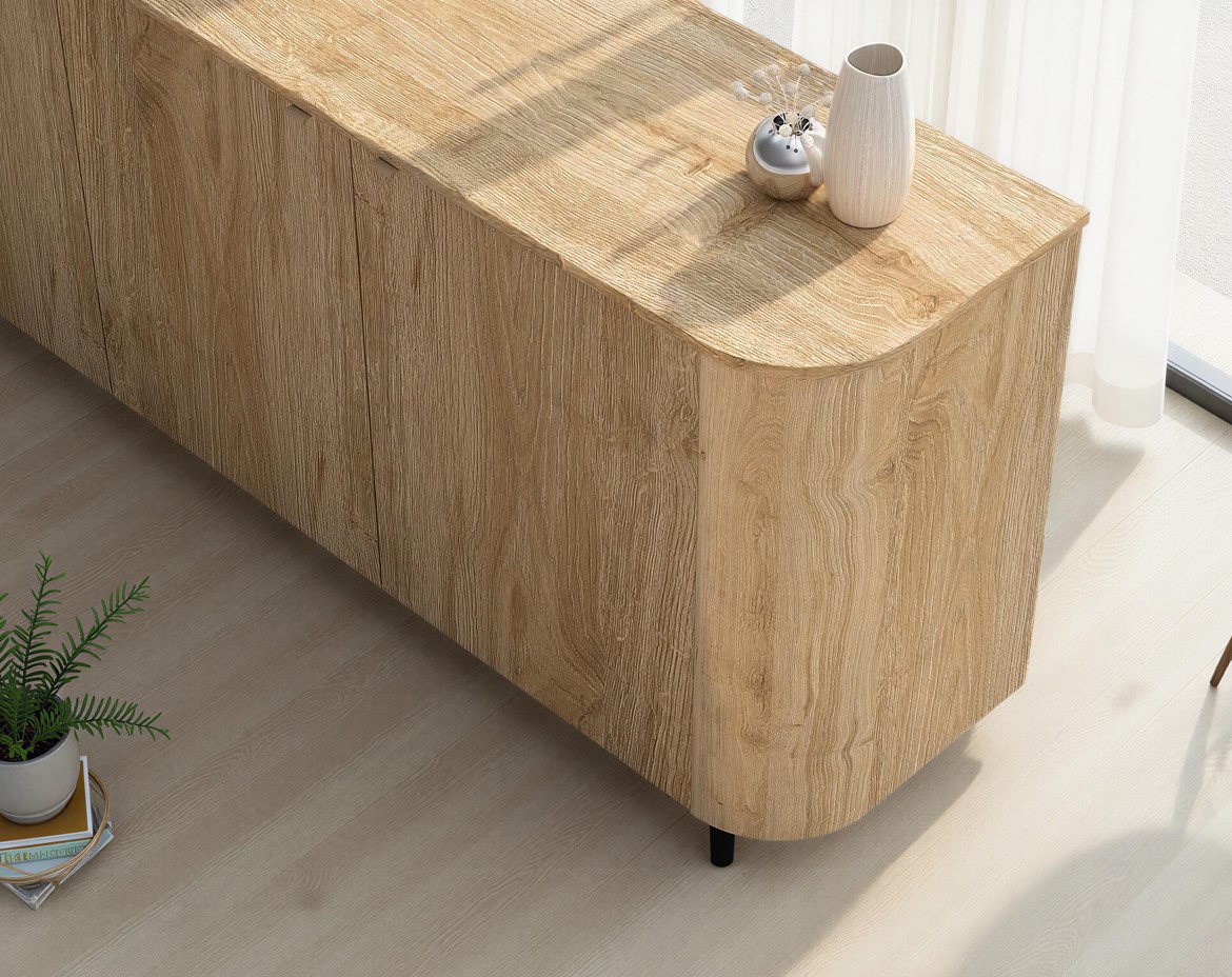 Modern groot dressoir in de kleur eiken cadiz met vier deuren voorzien van subtiele handgreepjes. De kast wordt stevig ondersteunt door moderne zwart metalen poten. De harmonieus gebogen elementen en afgeronde voorzijden zorgen voor een stijlvolle, mooie uitstraling. Achter de deuren zijn er vier ruime opbergvakken die voldoende opbergruimte bieden.