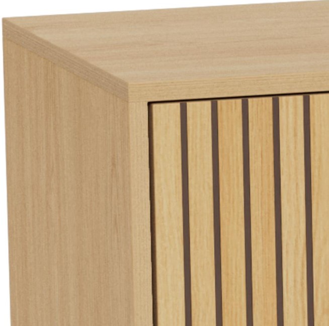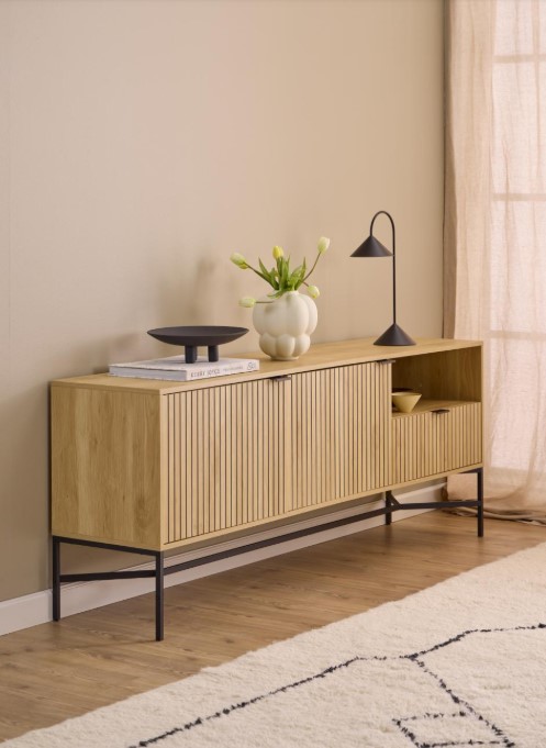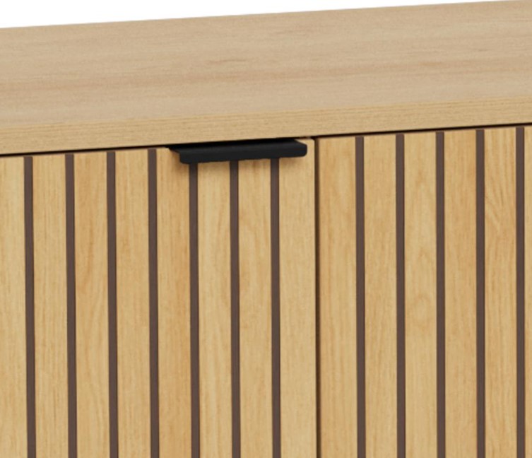 Modern dressoir in de kleur eiken met een trendy lamellenstructuur op de deuren en lade. De deuren en lade zijn voorzien van zwarte handgrepen. Het meubel wordt gecombineerd met zwart metalen onderstel.