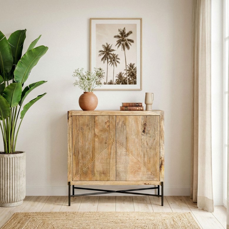 Moderne dressoir kast van massief mangohout gecombineerd met zwart metalen poten. De kast is voorzien van twee deuren met échte 3D houtfrezingen. Combineer dit meubel eventueel met de bijpassende andere meubelen uit dit programma.