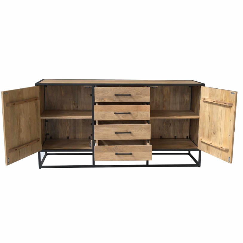 Modern TV dressoir in industriële woonstijl. Mango hout gecombineerd met metalen accenten. De deuren en laden zijn voorzien van metalen handgrepen.