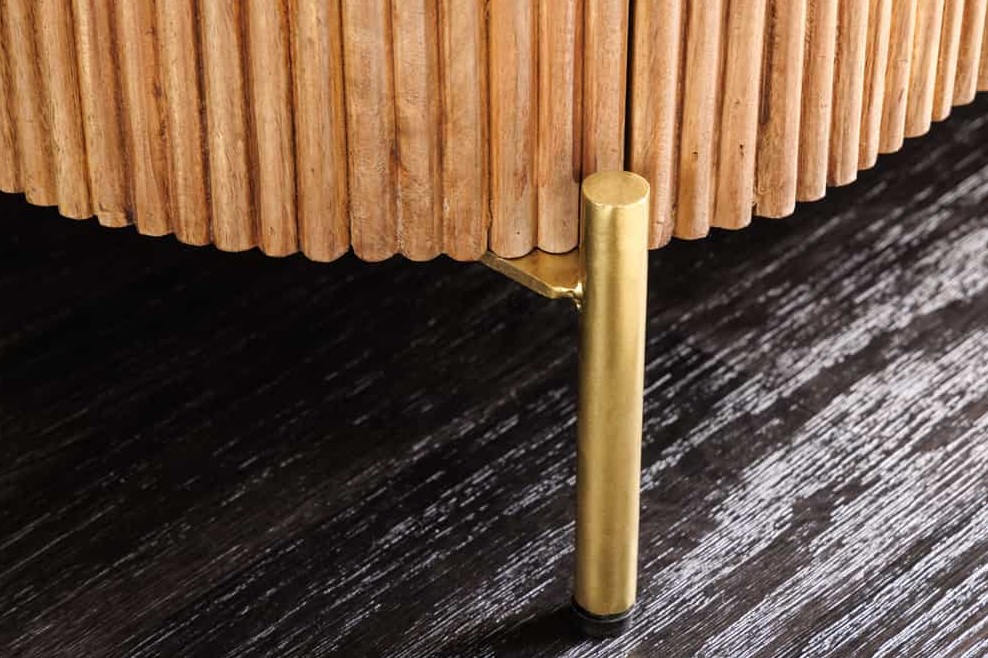 Deze smalle dressoir kast combineert tijdloze elegantie met een vleugje retro charme en biedt tegelijkertijd praktische opbergruimte. De ombouw van bruin, gelakt mangohout maakt indruk met zijn warme, natuurlijke uitstraling en wordt stijlvol benadrukt door verticaal lopende houten lamel latten. Het witte, gepolijste marmeren blad geeft een mooi accent. De kast biedt tevens veel opbergruimte voor decoratie of alledaagse voorwerpen.