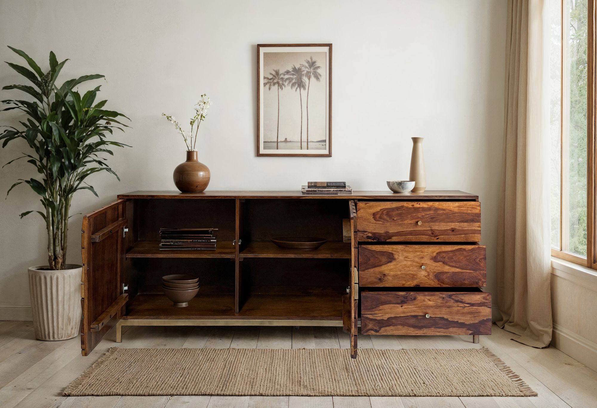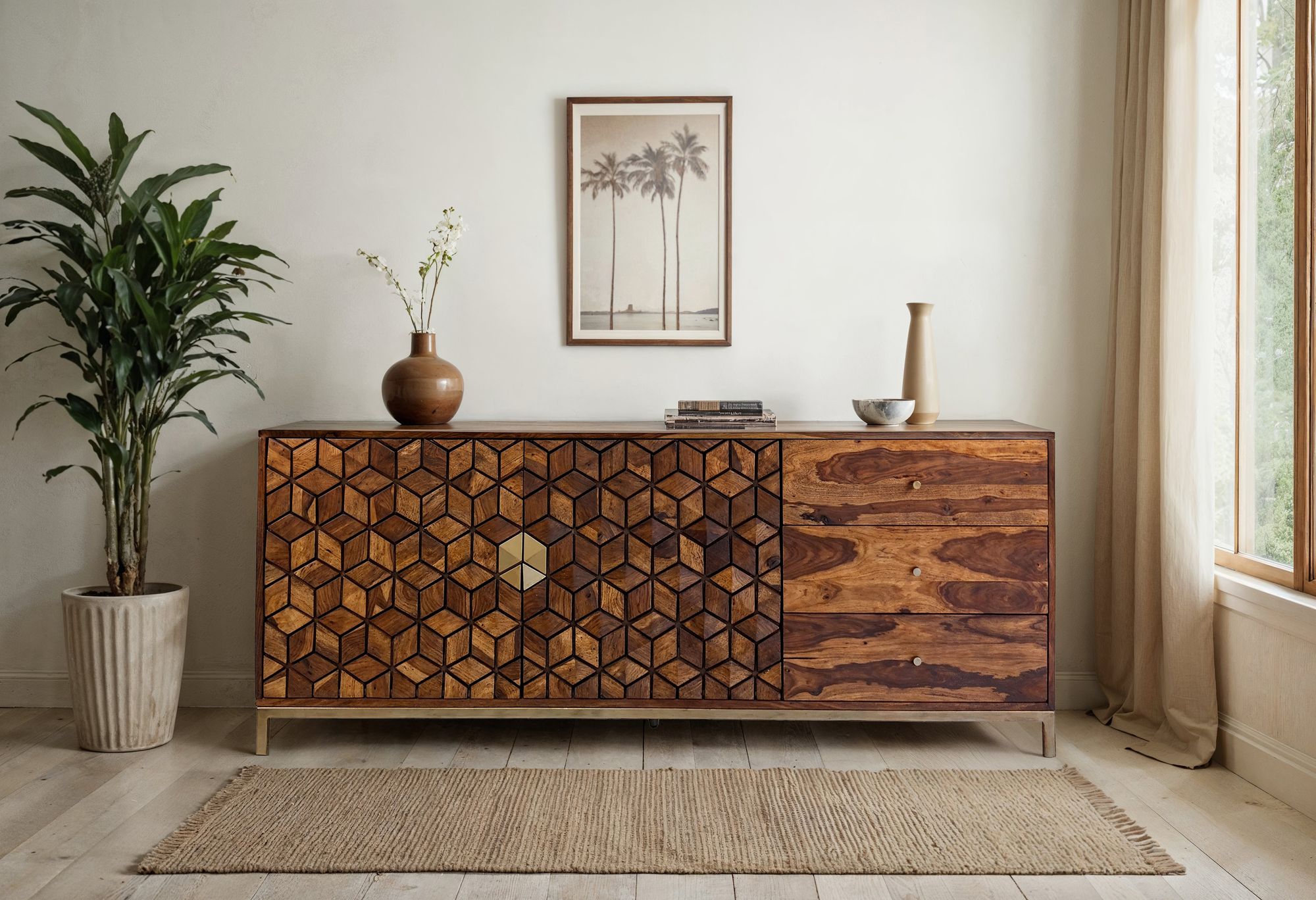 Modern design dressoir van massief sheesham hout gecombineerd met goudkleurige accenten. Het meubel heeft twee deuren en drie laden voorzien van goudkleurige handgrepen. De deuren zijn voorzien van écht 3D houtsnijwerk in een mooi patroon en openen door een push-to-open sluitsysteem. Ieder meubel is uniek en heeft unieke hout- en kleurpatronen.