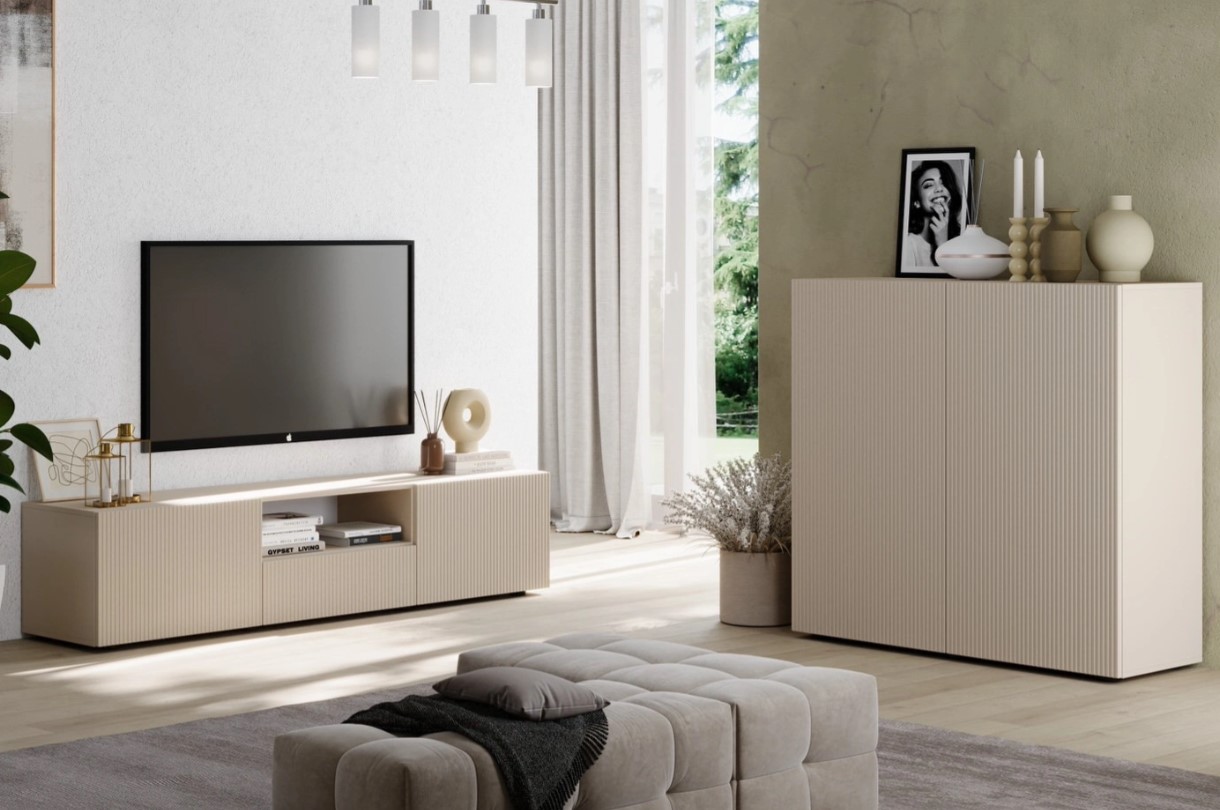 Moderne 2 deurs highboard kast in de kleur cashmere. De deurfronten zijn voorzien van een ribbel design. Combineer deze highboard kast met de overige meubelen uit dit woonprogramma om een mooi interieur te creëren.