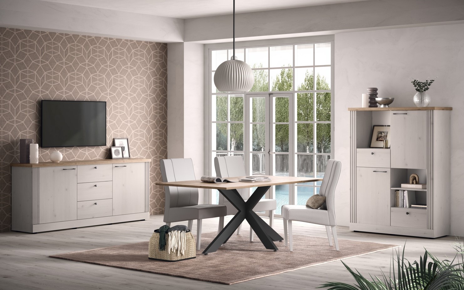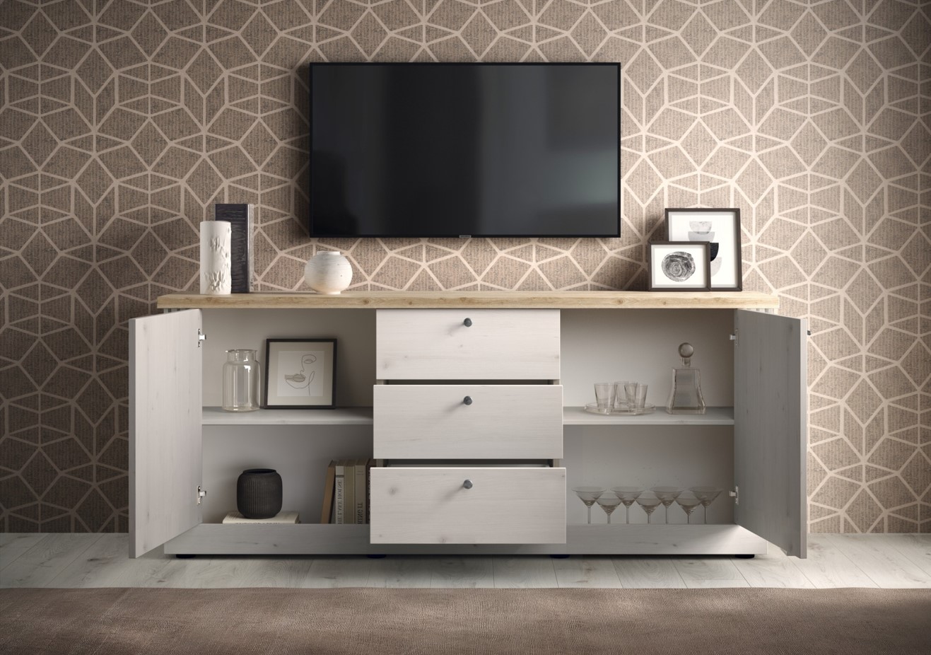 Landelijk modern sfeervol dressoir in de kleur wit (washed) gecombineerd met eiken kleur bovenpaneel. De deuren en laden zijn voorzien van zwarte handgrepen. Het dressoir biedt veel opbergruimte met achter iedere deur twee grote opbergvakken en en drie grote laden.