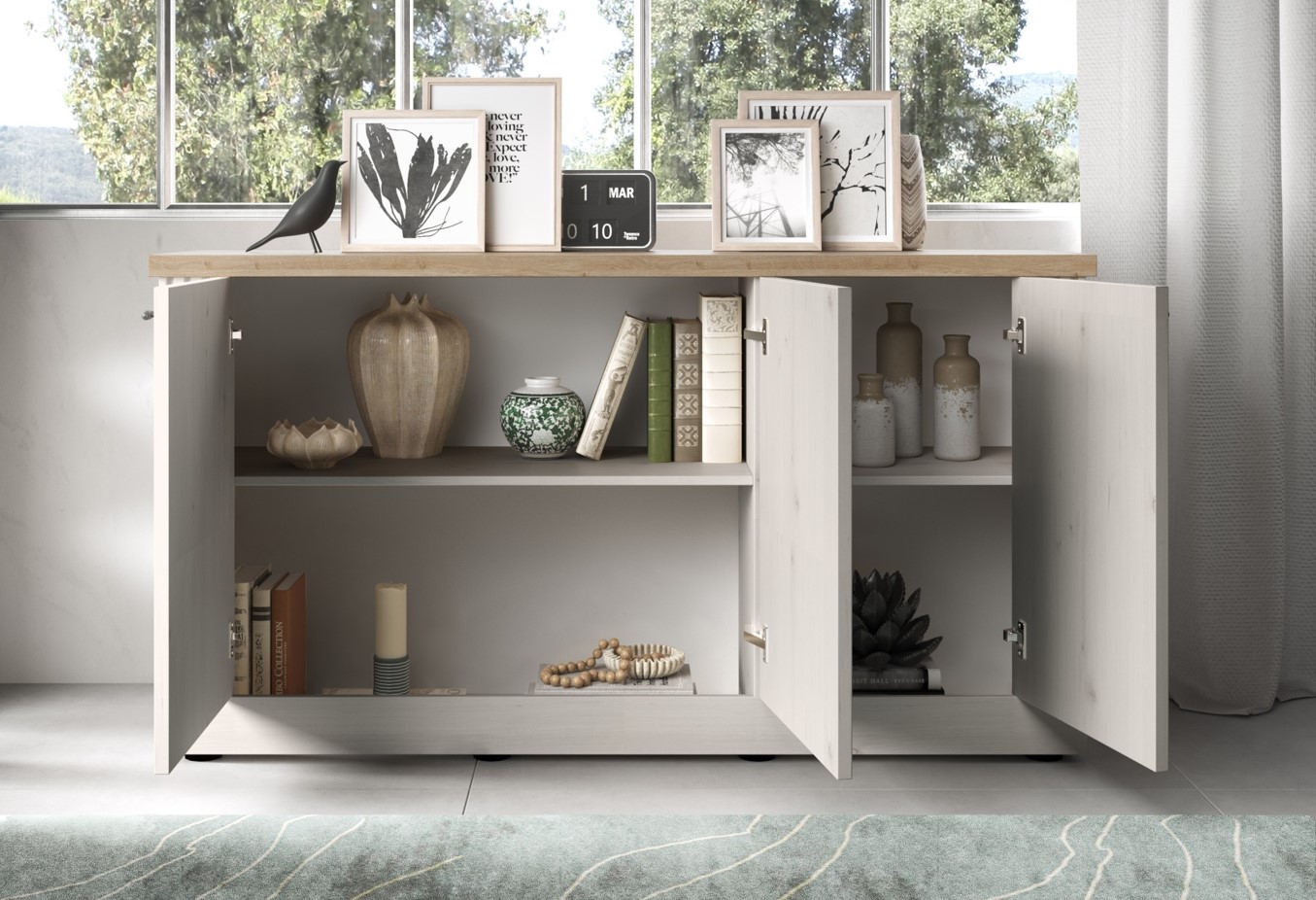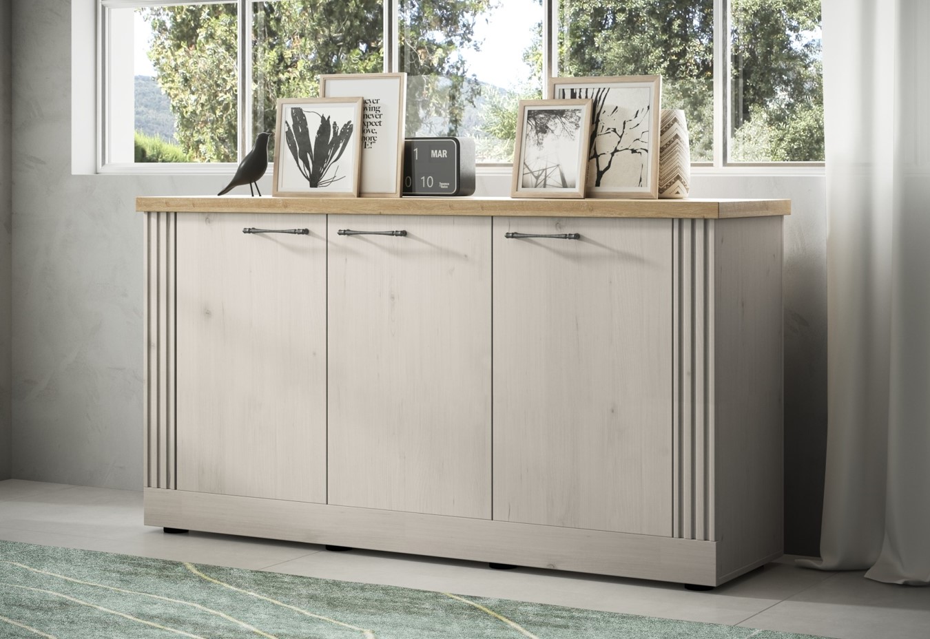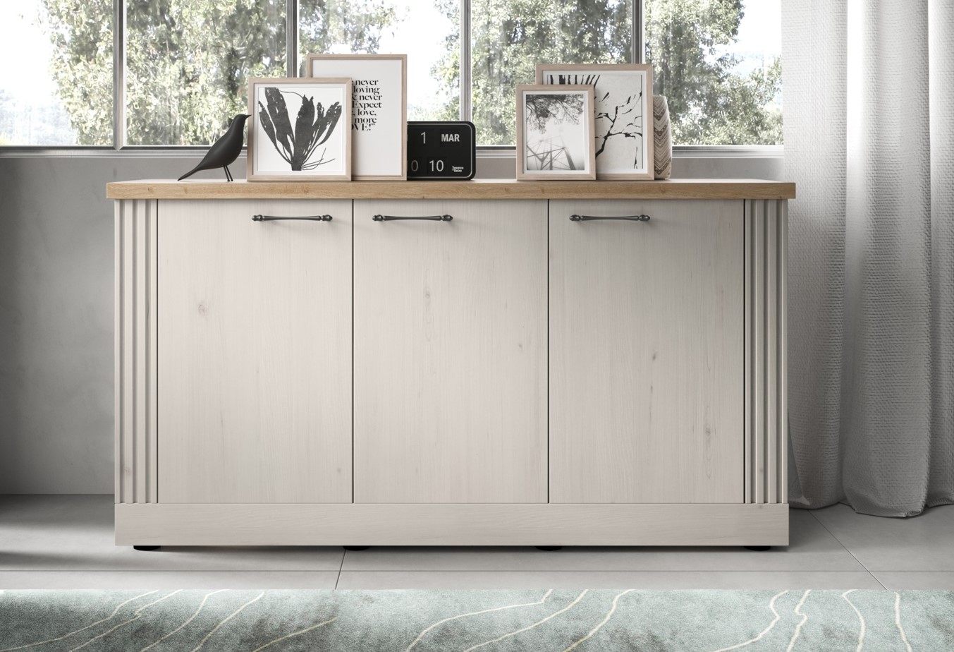 Landelijk modern sfeervol dressoir in de kleur wit (washed) gecombineerd met eiken kleur bovenpaneel. De drie deuren zijn voorzien van zwarte handgrepen. Het dressoir biedt veel opbergruimte met achter iedere deur twee grote opbergvakken.