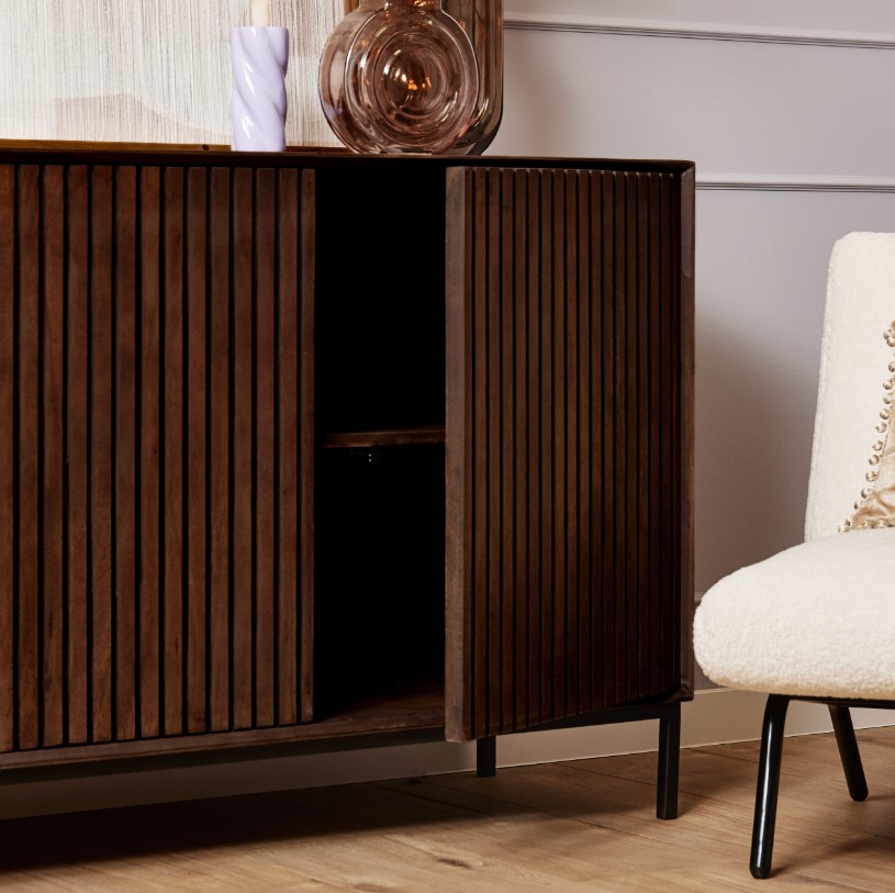 Modern dressoir van massief mangohout voorzien van drie deuren. De deuren zijn voorzien van een verticaal lattenpatroon en push-to-open sluitsysteem. Het meubel is afgewerkt met een donkerbruine finish. Het metalen frame is afgewerkt met een zwarte lak.