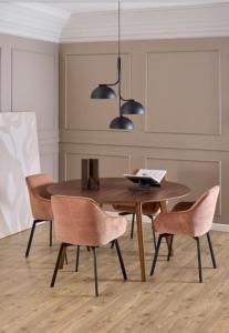 Deze ronde eettafel overtuigt met een geslaagde combinatie van modern design en praktische functionaliteit. Gemaakt van bruin gelakt mangohout, brengt het een warme en elegante uitstraling in huis. De tafel is gecombineerd met kolomvoet met massief houten lamellen patroon en heeft een deur in de kolomvoet, waarachter een geïntegreerde opbergruimte is verborgen. De tafel biedt niet alleen ruimte voor gezamenlijke maaltijden, maar ook extra opbergruimte voor glazen, flessen of servies. Deze eetkamertafel is verkrijgbaar in de afmetin...