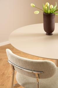 Stijlvolle ronde eettafel mat beige en voorzien van een beige trompet onderstel. De strakke en matte afwerking geeft deze tafel een exclusieve uitstraling! Deze tafel wordt geleverd in de afmeting: Ø:110 x H:74 cm Materiaal: MDF / metaal