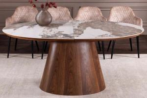 Sfeervolle  uitschuifbare eetkamertafel met tafelblad in ovale uitvoering voorzien van toplaag van keramiek taupe en ovale kolomzuil in walnoot. De tafel heeft een stijlvol schuin aflopend tafelblad. Dankzij de praktische uitschuifbare functie kan de tafel eenvoudig worden verlengd van 160 naar 200 cm – perfect voor wanneer gasten arriveren of er meer ruimte nodig is. Het keramische oppervlak is krasbestendig, hittebestendig en gemakkelijk schoon te maken, ideaal voor dagelijks gebruik. De kolombasis biedt beenruimte en een mod...