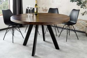 Moderne ronde massief houten eettafel van mangohout gecombineerd met een metalen kruispoot onderstel. Het tafelblad is donkerbruin Kenmerken: Tafelblad is behandeld met naturel lak en hierdoor vochtafstotend Stoere look door de kleurnuances en houtnerven Tafelbladdikte 6 cm ( 3 cm massief + 3 cm opgedikt) Dikte poten 50 x 100 mm Biedt plaats aan 4-5 personen Deze eettafel heeft de ca. afmeting breedte x diepte x hoogte:  Ø 130 x 76 cm Kleurcombinatie: Tafelblad: donkerbruin Onderstel: zwart Material...