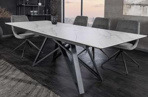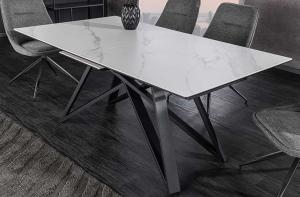 Moderne stijlvolle design eetkamertafel met tafelblad van krasbestendig keramiek. Gecombineerd met een prachtig zwart metalen design onderstel. Deze luxe eetkamertafel is leverbaar in de afmeting bxdxh: 180-220-260 x 90 x 76 cm Kleurcombinatie: Tafelblad wit met grijze accenten Design onderstel zwart Materiaalcombinatie: Tafelblad glas keramiek 13mm dik Frame van metaal poedercoating