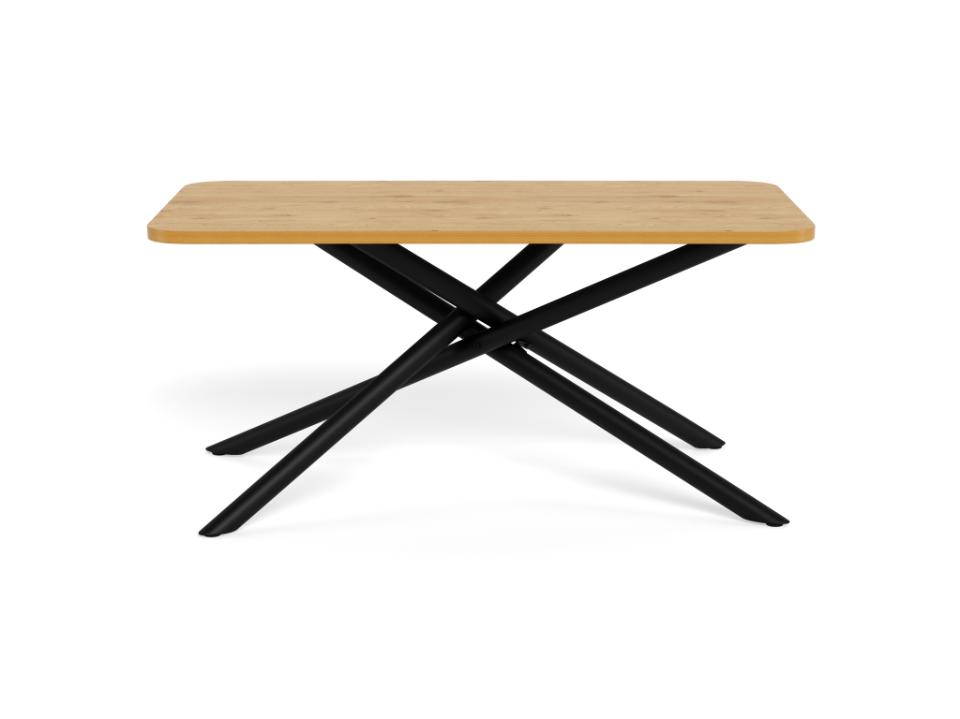 Moderne eetkamertafel met vriendelijke rond vormgegeven tafelbladhoeken. Het tafelblad wordt gecombineerd met modern metalen zwart onderstel.
