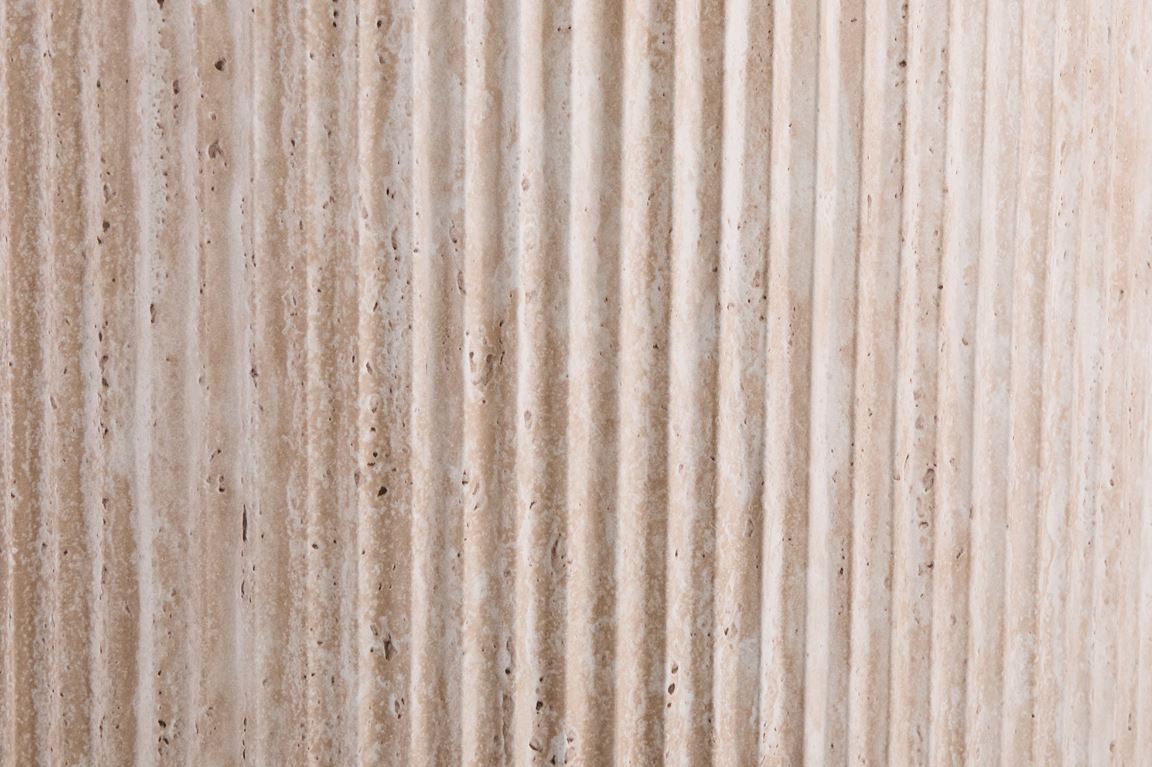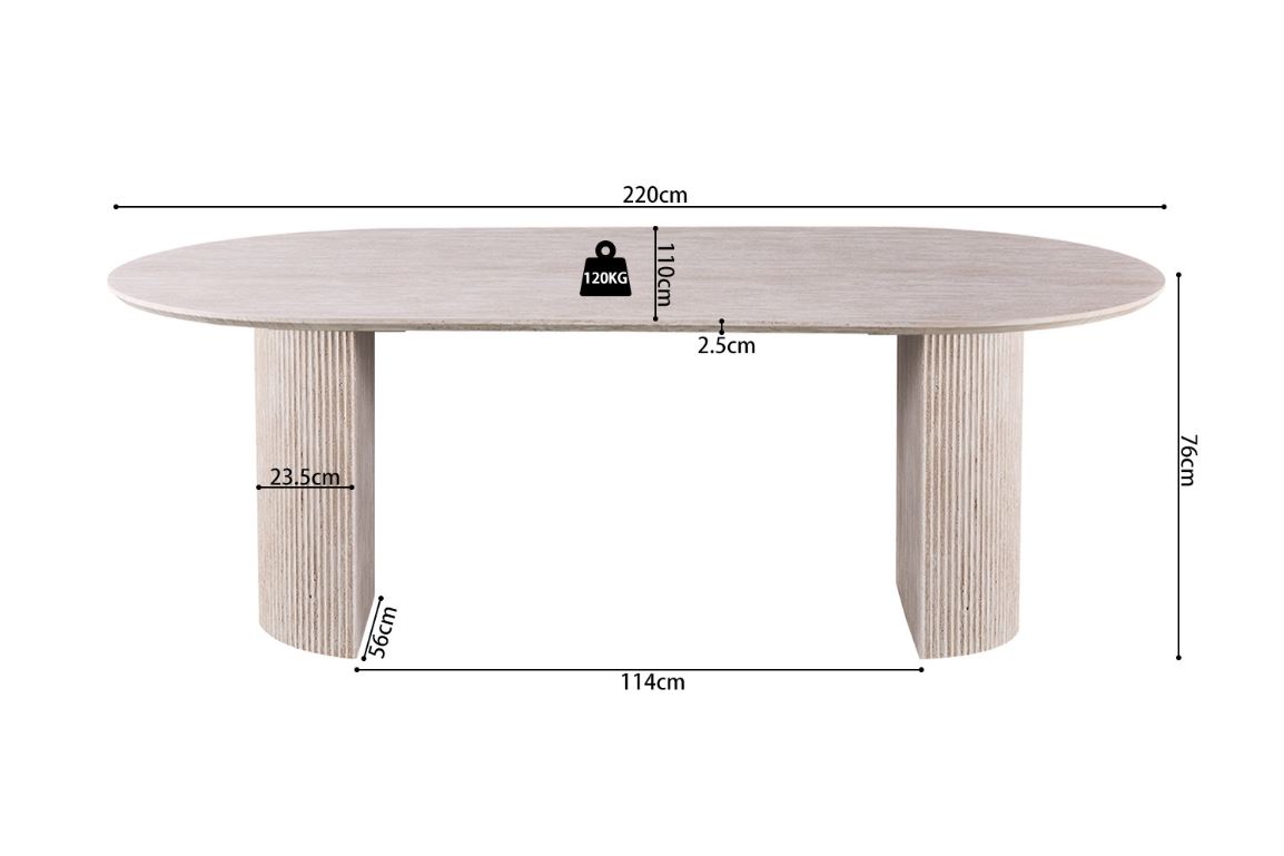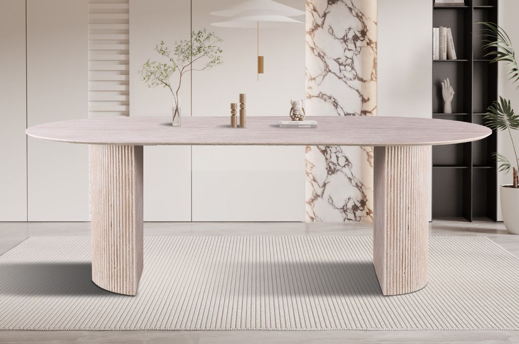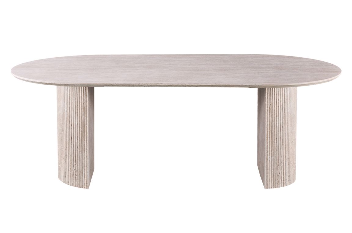 Ovale eetkamertafel met tafelblad met 3D structuur decor in de kleur travertin. De kolompoten zijn voorzien van een verticaal ribbelpatroon.
