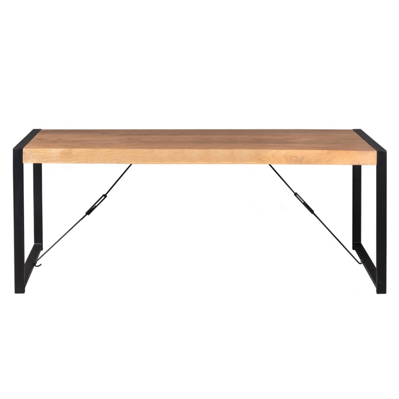 Eetkamertafel met mango houten tafelblad gecombineerd met metalen frames. Het tafelblad heeft een gladde afwerking. De houtstructuur en de kleurnuances in het tafelblad geven deze tafel een mooie karaktervolle uitstraling.