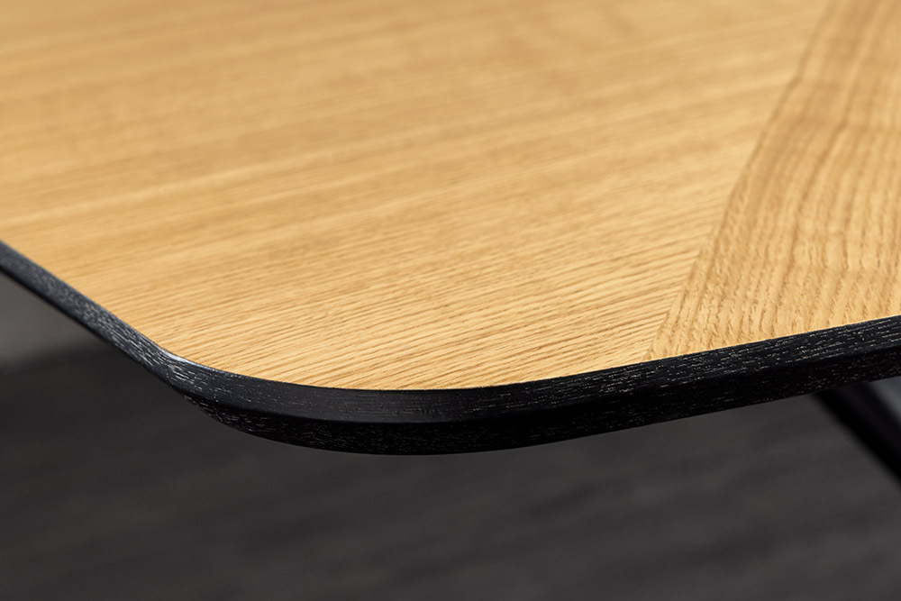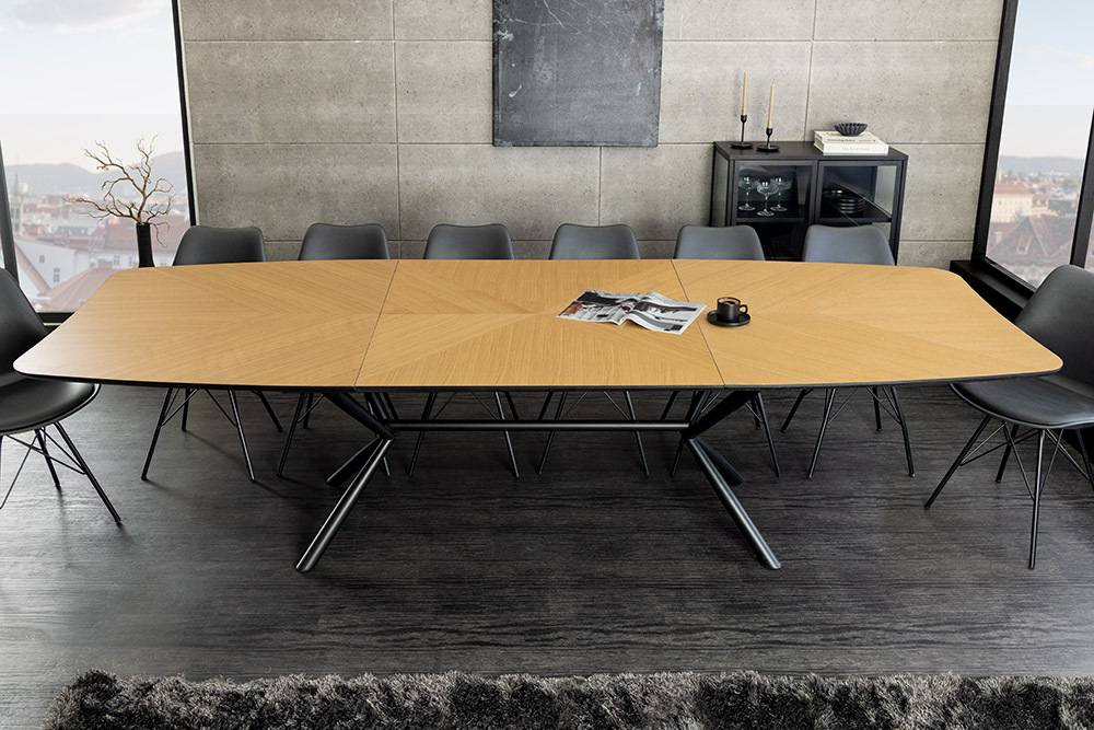 Met deze uitschuifbare eettafel haal je modern design met een doordachte functie in huis. Het eiken naturelkleurige tafelblad met fijn echt houtfineer geeft de tafel een sfeervolle uitstraling, terwijl het zwart gecoate metalen frame met zijn opvallende lijnen voor een stijlvol contrast zorgt. Het resultaat: een echt statement meubel voor je eethoek.