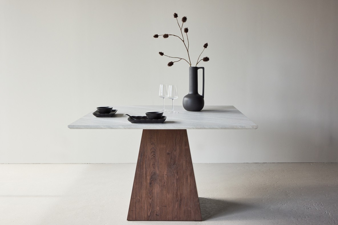 Moderne vierkante eetkamertafel voorzien van schuin aflopend lichtgrijs tafelblad in stone-look gecombineerd met kolomvoet in trapezevorm. Het tafelblad is gemaakt van MDF met 3D-decor afwerking in een elegante steenachtige afwerking, wat een natuurlijke, tastbare uitstraling geeft. De stevige walnootkleurige kolomzuil zorgt voor een warm contrast en geeft de tafel een natuurlijke uitstraling. Met zijn royale afmeting biedt deze tafel volop ruimte voor gezellige maaltijden en alledaagse gesprekken.