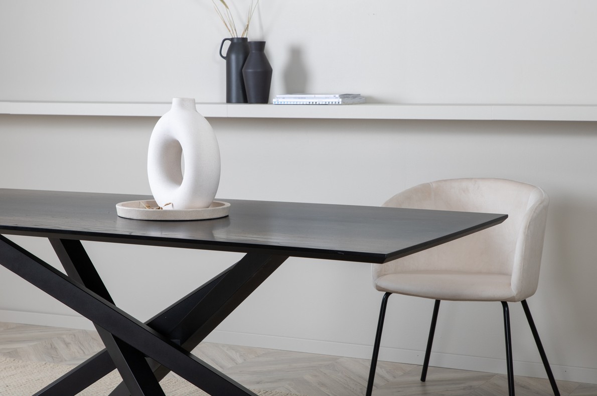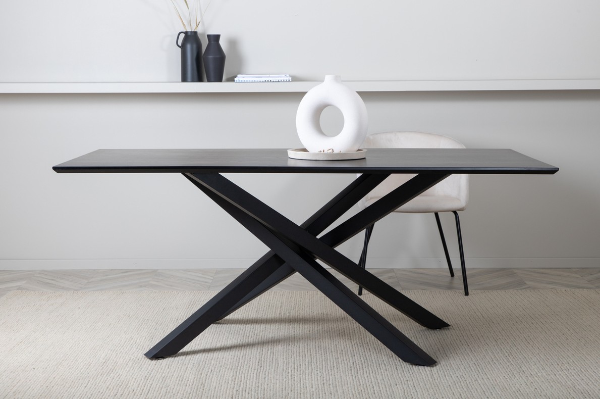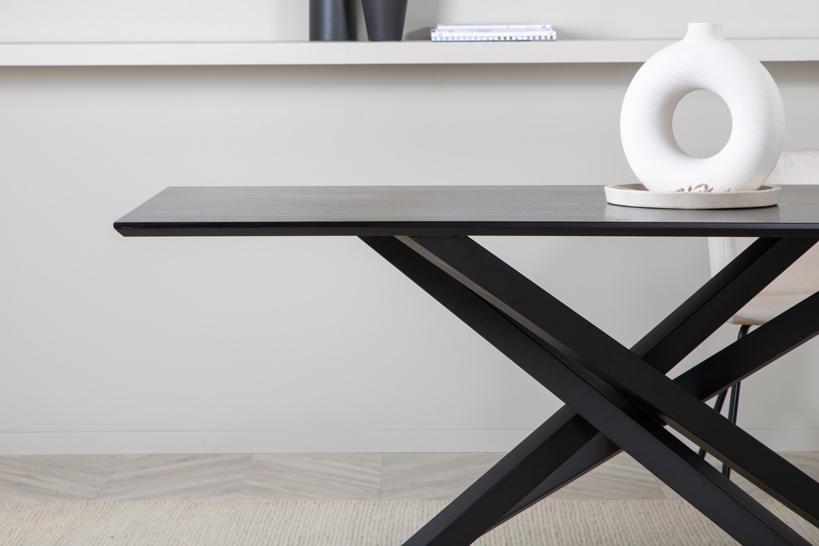 Moderne rechthoekige eettafel met een luxueus karakter en trendy details in het ontwerp. Het tafelblad in zwarte kleur is gemaakt van MDF-fineer. De tafel heeft een strak moderne uitstraling met gekruiste metalen zwarte poten, wat zorgt voor een eyecatcher effect. Het tafelblad heeft schuin aflopende tafelranden en een mooie gladde afwerking waardoor de tafel een mooie uitstraling krijgt.