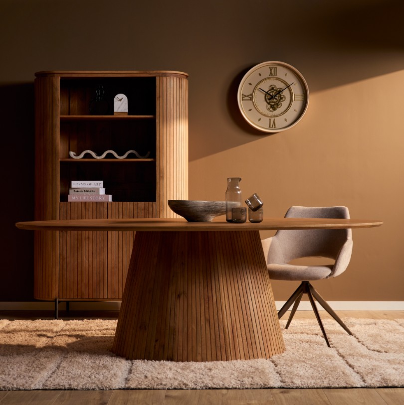 Moderne ovale eettafel compleet van massief mangohout gecombineerd met ovaal zuilkolom. Gezellige sfeervolle tafel waarbij er rondom veel ruimte is om stoelen te plaatsen.