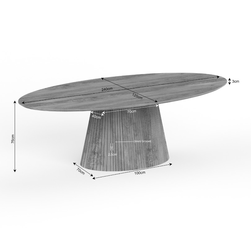 Grote moderne ovale eettafel compleet van massief mangohout gecombineerd met ovale zuilkolom. Het tafelblad heeft een dikte van 3 cm met een schuin aflopende rand. Gezellige sfeervolle tafel waarbij er rondom veel ruimte is om stoelen te plaatsen.