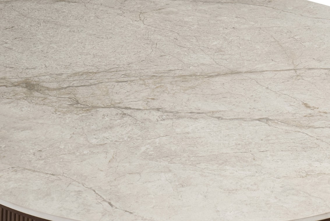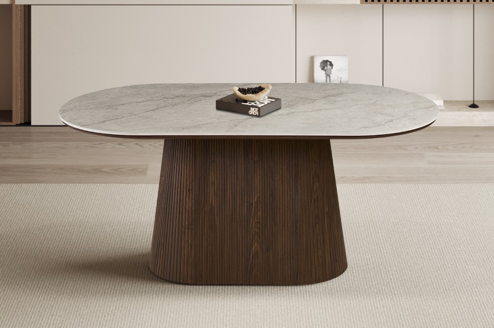 Sfeervolle eetkamertafel donkerbruin eiken kelur met tafelblad van beige cintered stone afwerking.