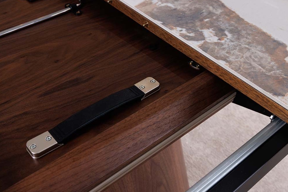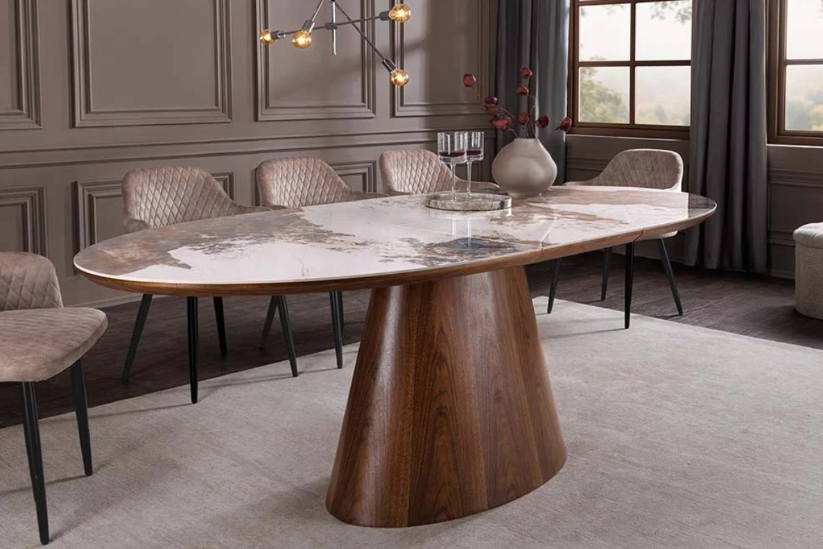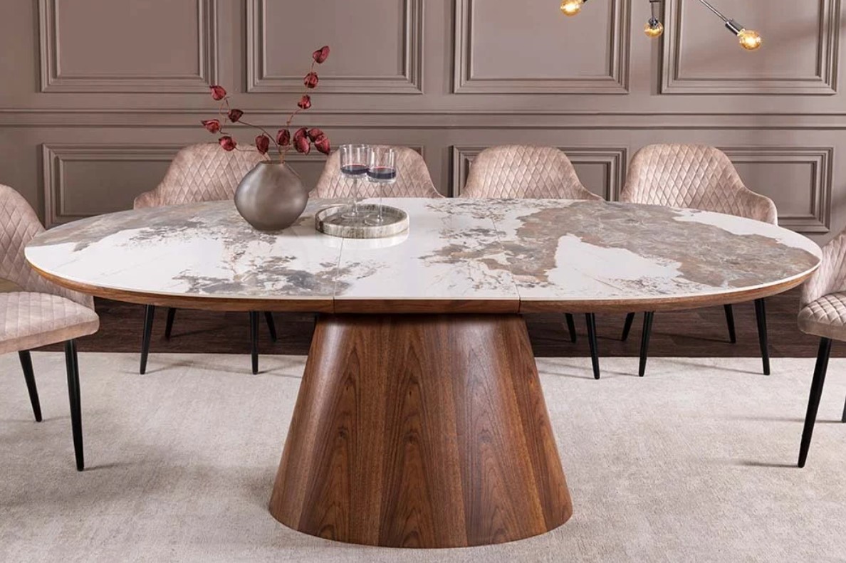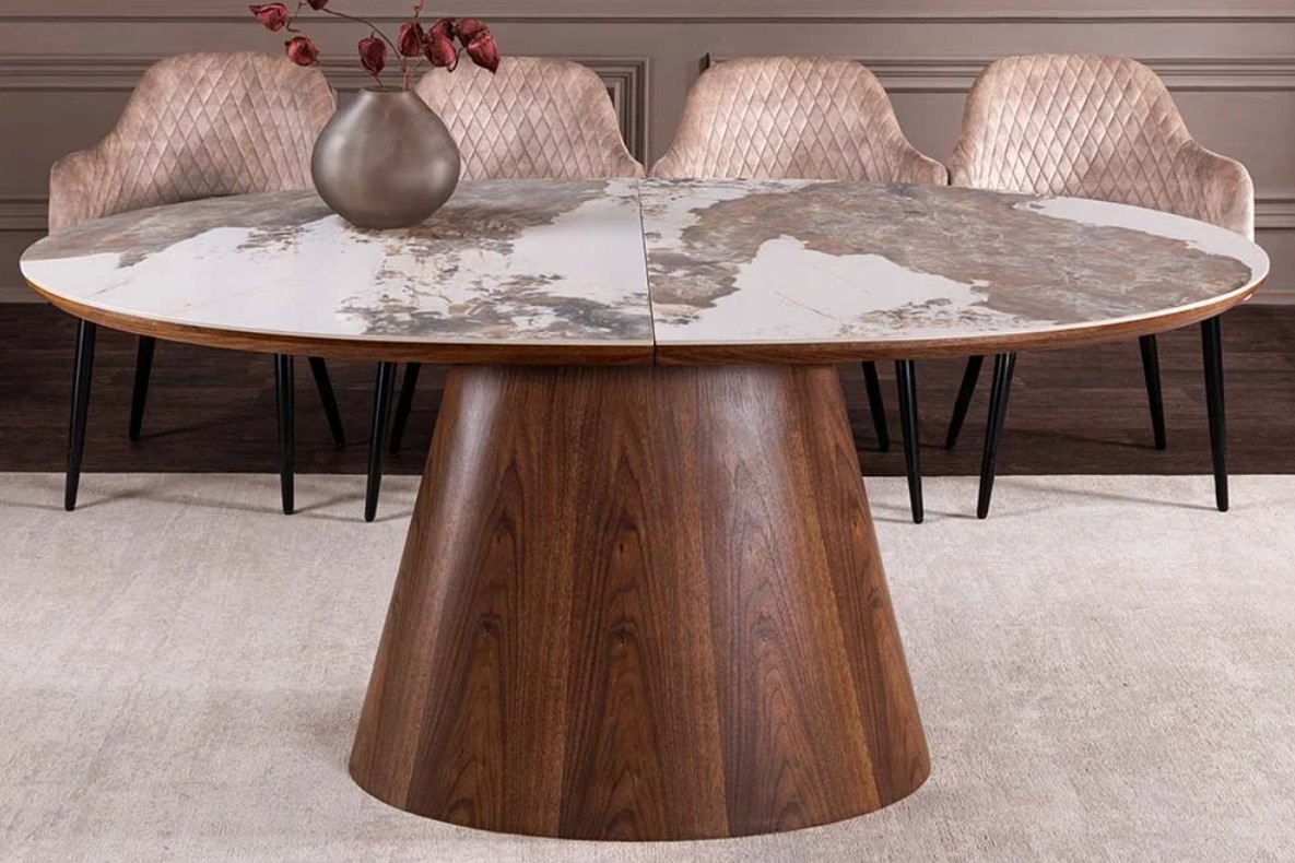 Sfeervolle  uitschuifbare eetkamertafel met tafelblad in ovale uitvoering voorzien van toplaag van keramiek taupe en ovale kolomzuil in walnoot. De tafel heeft een stijlvol schuin aflopend tafelblad.