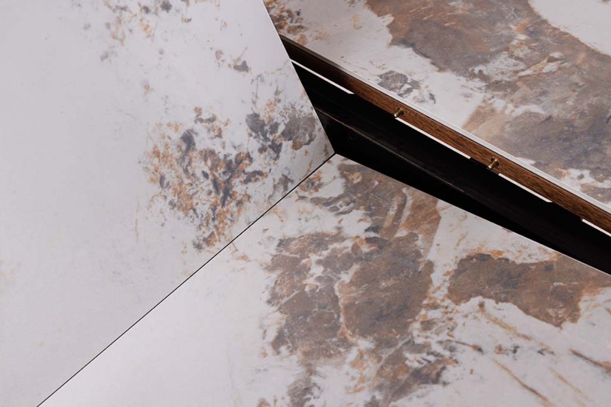 • Deze eetkamertafel walnoot taupe keramiek staat niet opgesteld in onze showruimte