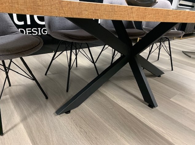 Gezellige sfeervolle tafel met fraai design onderstel waardoor er veel ruimte is om stoelen te plaatsen.