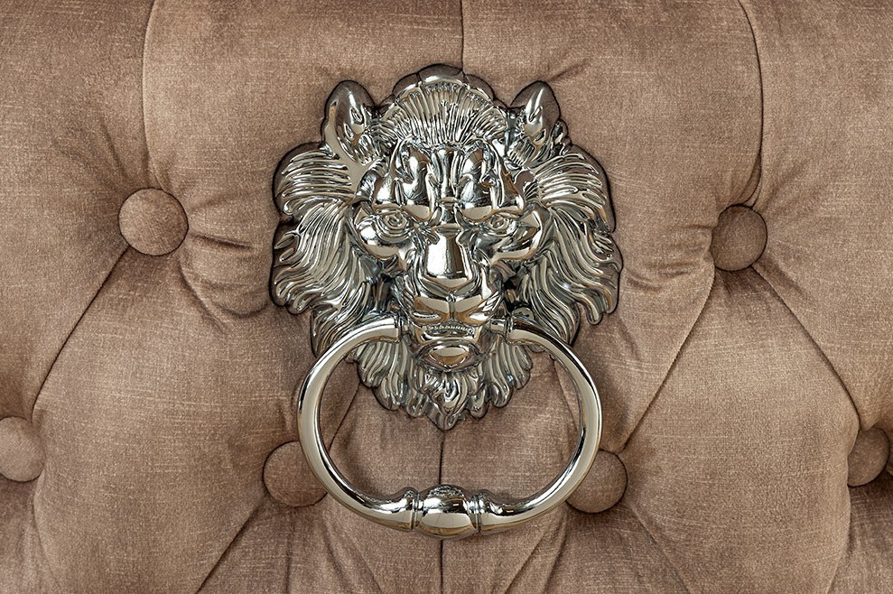 Deluxe stoel beige fluweel met leeuwenkop zwarte poten