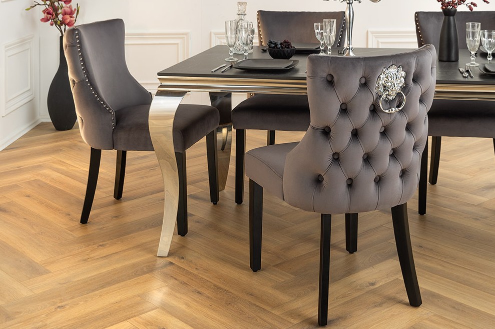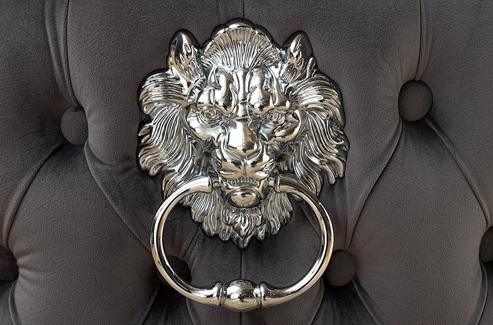 Deluxe stoel grijs fluweel met leeuwenkop zwarte poten