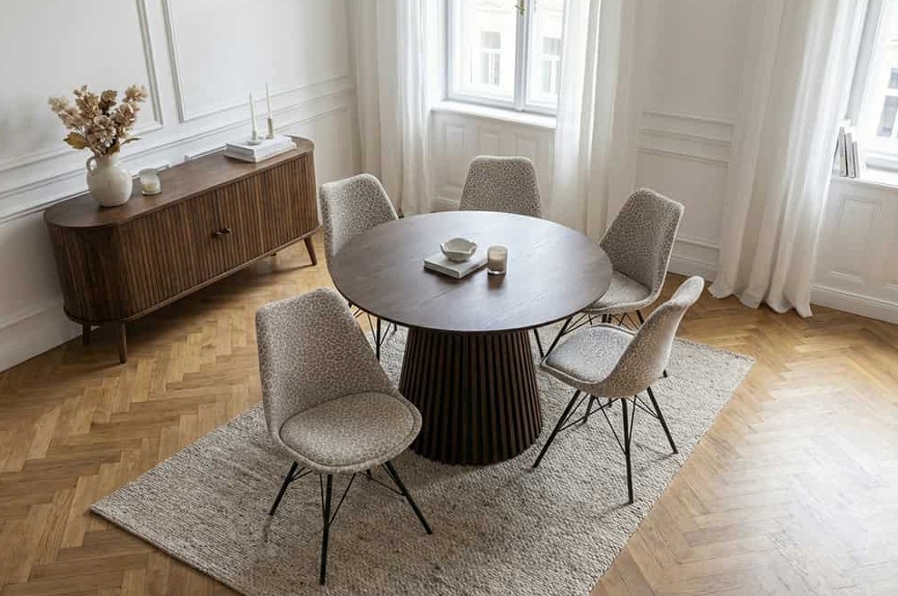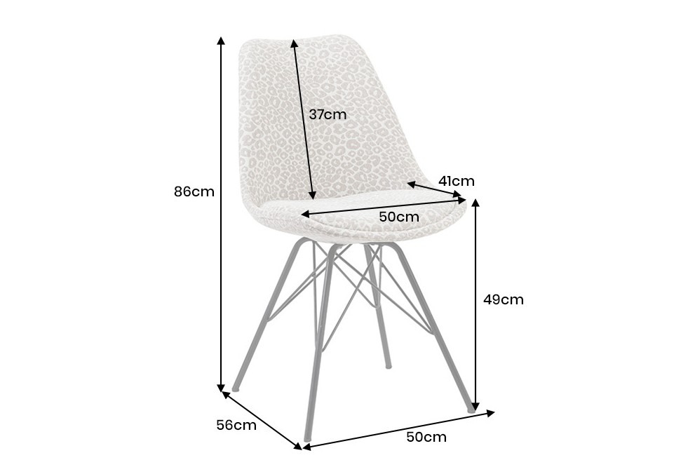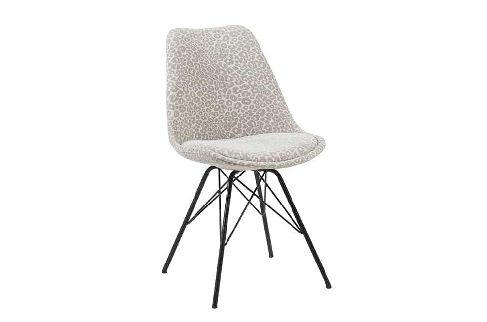Eetkamerstoel voorzien van bekleding met beige luipaard print gecombineerd met zwarte moderne stoelpoten.