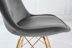 Eetkamerstoel met modern ontworpen kuipzitting gecombineerd met comfortabele zachte stoffen bekleding en metalen glanzende poten in gouden kleur.