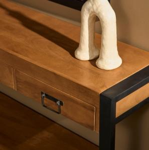 De sidetable industrial 120 cm dankt haar industriële uitstraling aan de combinatie van hout en metaal. De sidetable is voorzien van één lade en open opbergruimte. Deze sidetable is bestelbaar in de afmeting bxdxh: 120 x 35 x 75 cm Overige afmetingen bxdxh: open opbergruimte 64x33x11 cm lade 45x28x8 cm Kleurcombinatie: bruin / zwart Materialen: massief mangohout / metaal